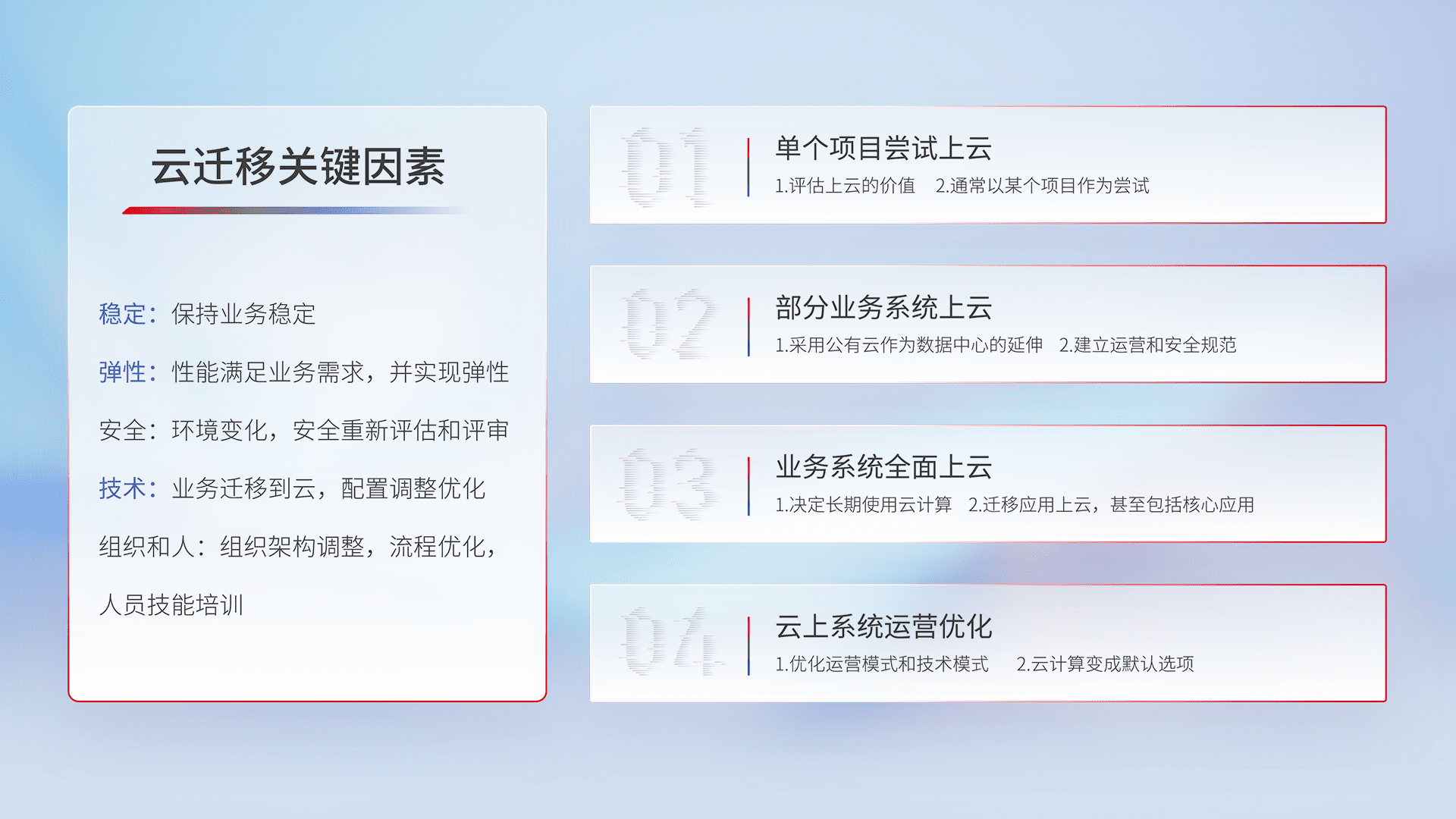 结合实际业务,,,,从规划设计、、、云平台选型、、、、云原生改造、、数据迁移、、集成交付,,迁移全过程为客户识别最佳上云路径,,,,做好风险识别管理,,,,设计网络架构、、、、身份权限、、安全审计合规、、、、操作审计、、、日志审计、、、、监控告警策略、、、、多站点容灾设计等,,,,对云上基础设施进行整体规划,,提升IT治理水平,,以满足弹性、、、、高可用、、高性能的需求。。。